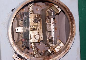 | These situations both resulted in electrical fires. In the image on the right, an unlicensed electrician had actually inserted the saws-all blades that melted down under load! Be sure that your electrical work is performed by a qualified professional! |